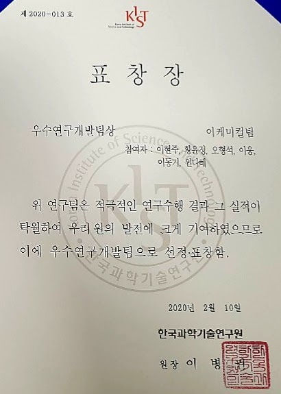 e-Chemical 연구팀이 2018년 KIST 우수연구개발팀상을 수상하였다.
