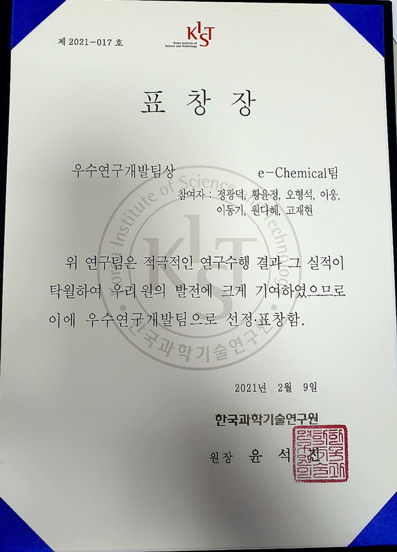 e-Chemical 연구팀이 2020년 KIST 우수연구개발팀상을 수상하였다.