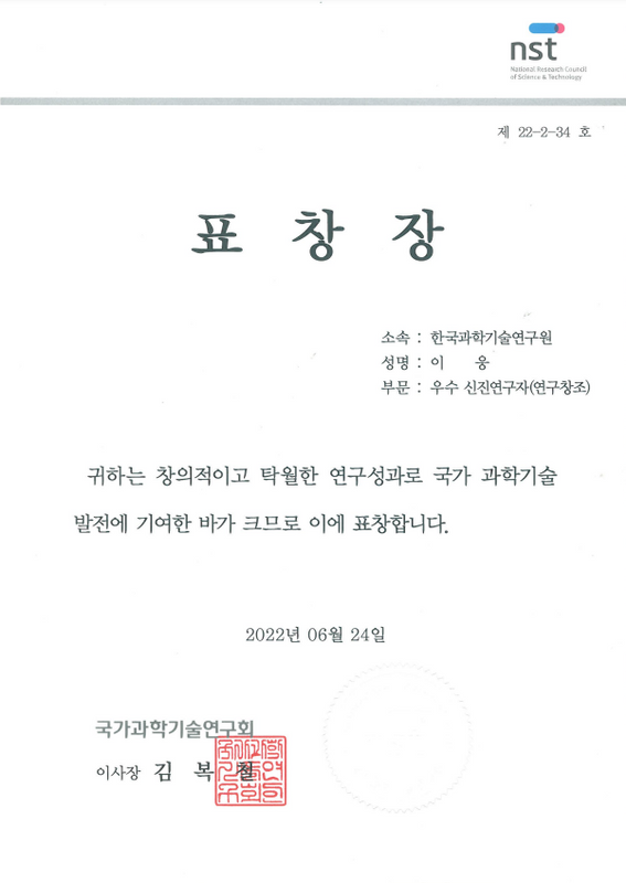 News List2022. 06.Award이웅 책임 NST 우수 신진연구자 수상이케미컬 연구팀의 이웅 책임연구원이 국가과학기술연구회(NST) 우수 신진연구자 부문 표창을 수상하였다.Back to News