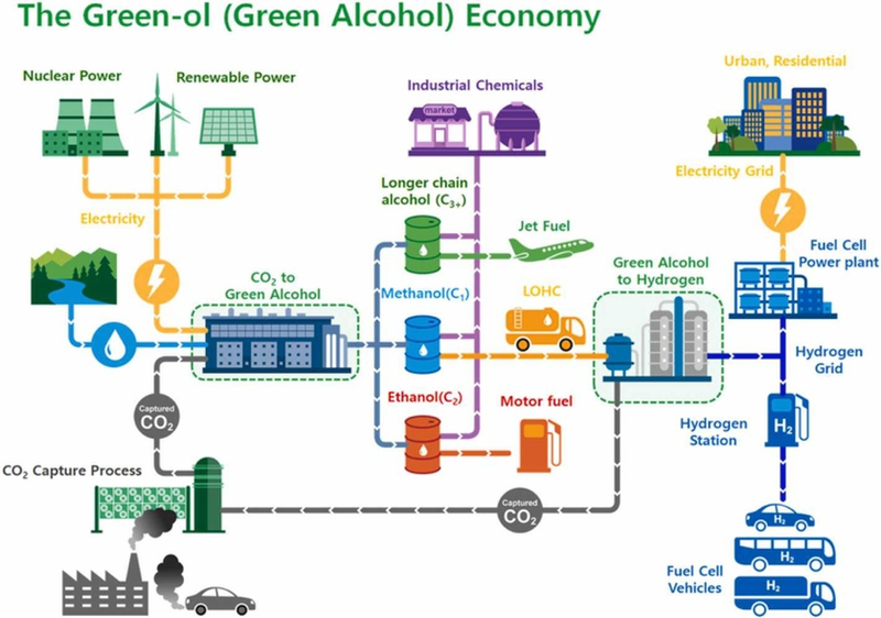 KIST 청정신기술연구본부 민병권 본부장이 제시한 ‘그린-올(Green-ol) 경제’는 화력발전소, 제철소 등 이산화탄소 배출원에서 CO₂를 포집하여 전기화학적 반응으로 메탄올, 에탄올 등 다양한 알코올로 전환하는 개념이다.