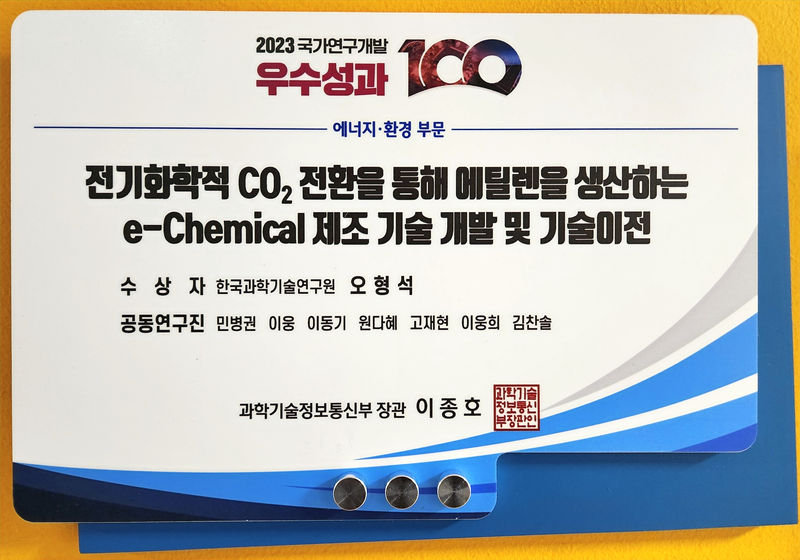 News List2023. 12.Award2023 국가연구개발 우수성과 100선 선정e-Chemical 연구진과 e-Chemical 기술개발 과제가 2023년 국가연구개발 우수성과 100선에 선정되었다.Back to News