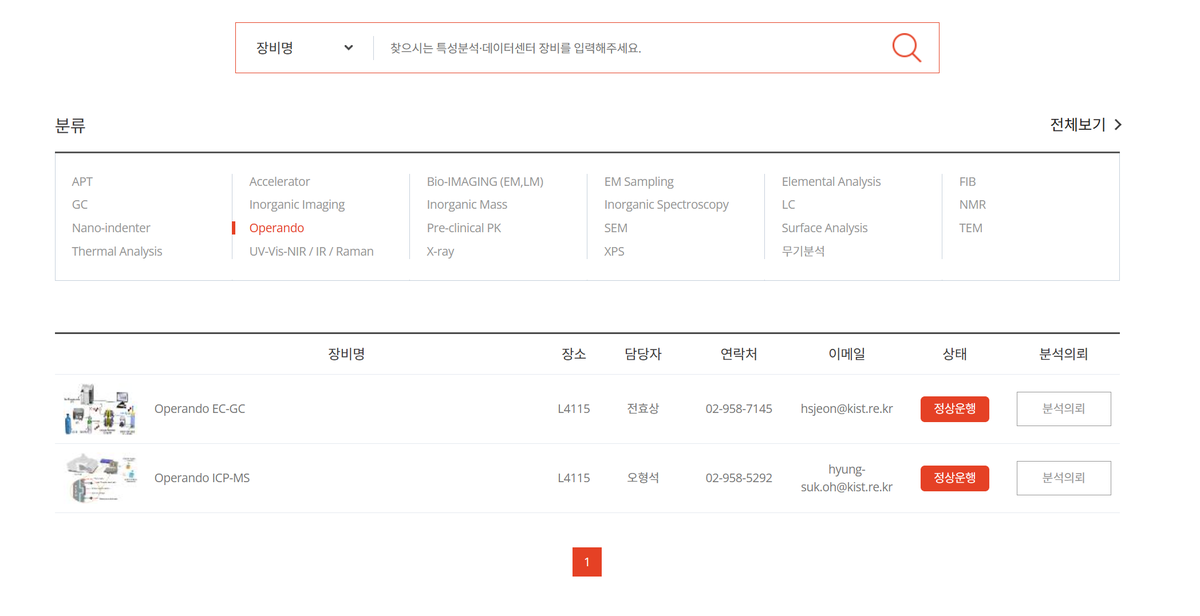 화면 중상단의 "분류" 섹션에서 Operando를 클릭하면 관련 장비 목록이 표시됩니다.