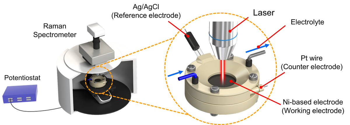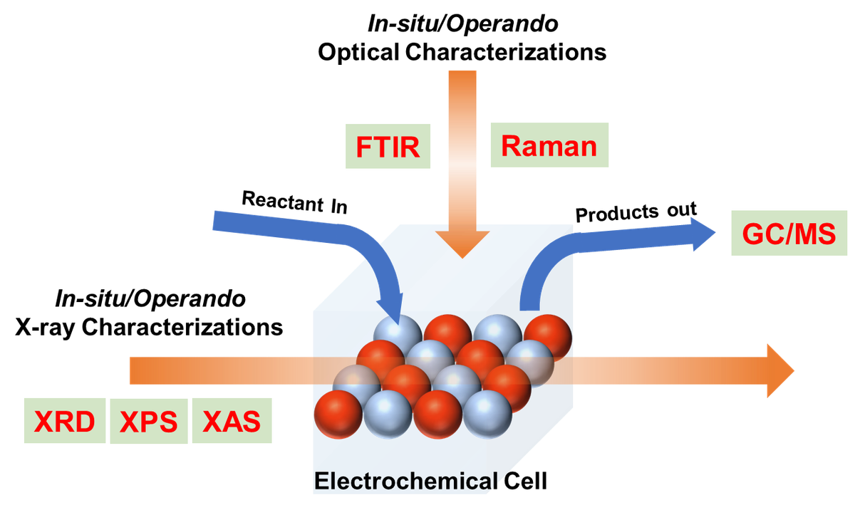 - 반응물/생성물/전해질: in-situ ATR-FTIR, Raman